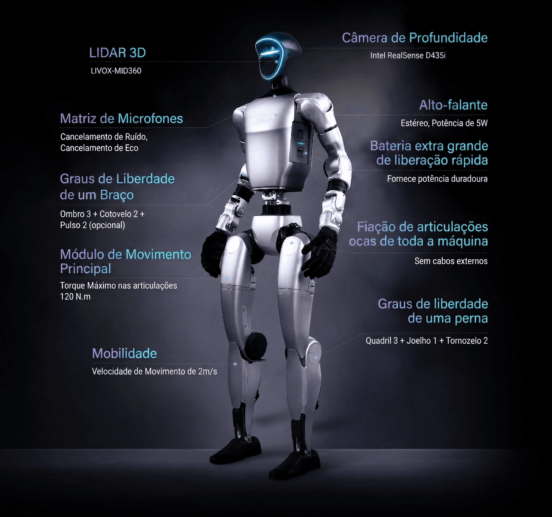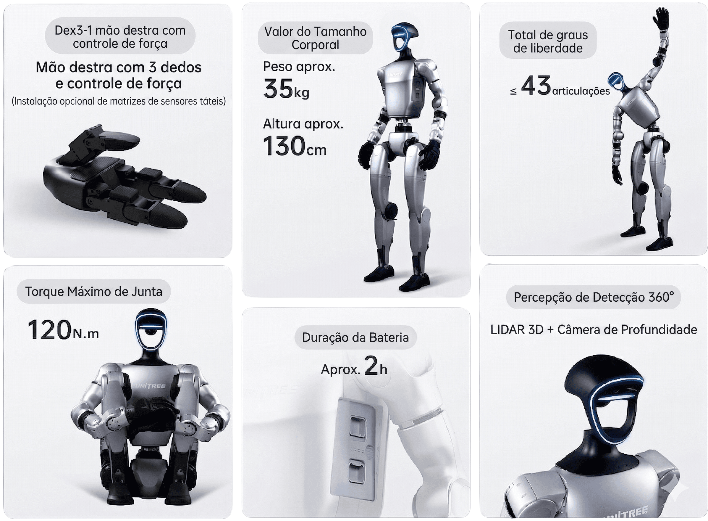 | Graus de Liberdade por Mão | / | 7 (Controle de força opcional de mão de três dedos) +2 (Opcional 2 graus de liberdade adicionais no pulso) *Parâmetros da mão hábil de três dedos Dex3-1: O polegar possui 3 graus de liberdade ativos; o dedo indicador possui 2 graus de liberdade ativos; o dedo médio possui 2 graus de liberdade ativos. *Dex3-1 pode opcionalmente ser instalada com matrizes de sensores táteis | |